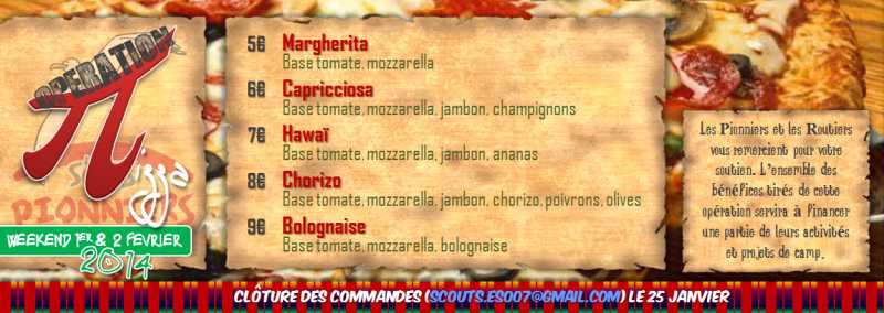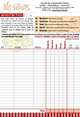 Cette année encore, les Pionniers de Péruwelz retroussent leurs manches pour vous proposer leurs pizzas artisanales. Et pour cette édition, les Routiers seront également de la partie. Merci de faire circuler l'information autour de vous: affiches, feuilles de commandes (cliquez sur l'image ci-dessous), coups de téléphone dans la famille, les collègues, ...